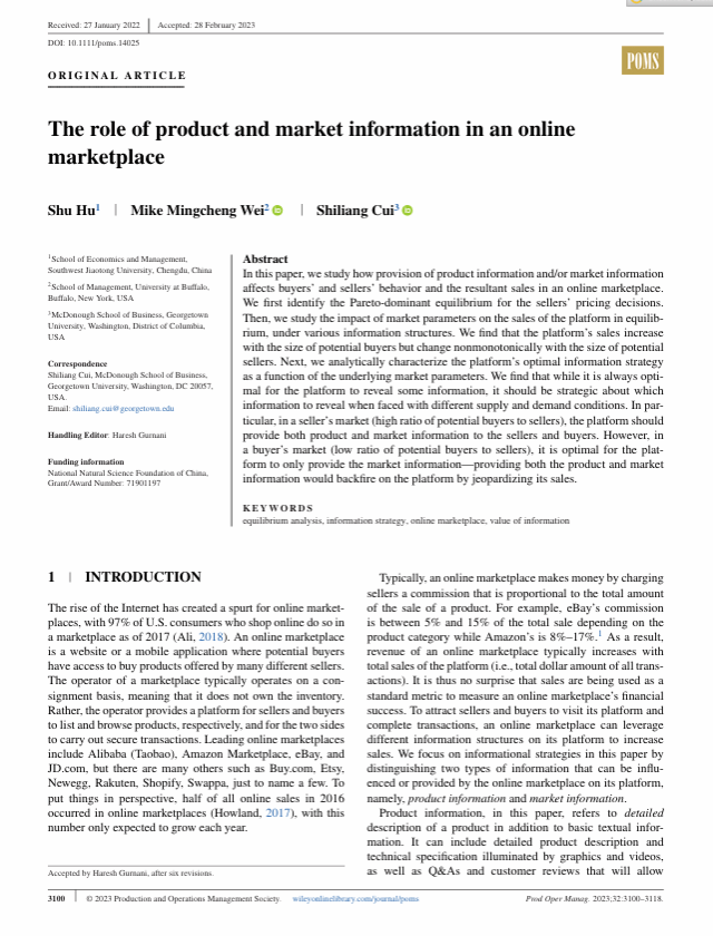 best365网页版登录官方网站胡书老师于2023年6月在UTD 24期刊Production and Operations Management在线公开发表题为The Role of Product and Market Information in an Online Marketplace的论文。该论文研究了在线市场中产品信息和/或市场信息的提供如何影响买家和卖家的行为以及相应的销售额。论文首先确定了卖方定价决策的帕累托优势均衡。然后,在多种信息结构下分析了均衡状态下重要参数对平台销售额的影响。最后,界定了平台的最优信息策略。文章发现,虽然平台披露某些信息总是最优的,但在面对不同的供需条件时,披露哪些信息应该是战略性的。特别地,在卖方市场中(潜在买家和卖家的比例很高),平台应该同时向卖家和买家提供产品和市场信息。然而,在买方市场中(潜在买家与卖家的比例较低),平台只提供市场信息是最优的--同时提供产品和市场信息只会对平台产生适得其反的影响并损害平台的销售额。