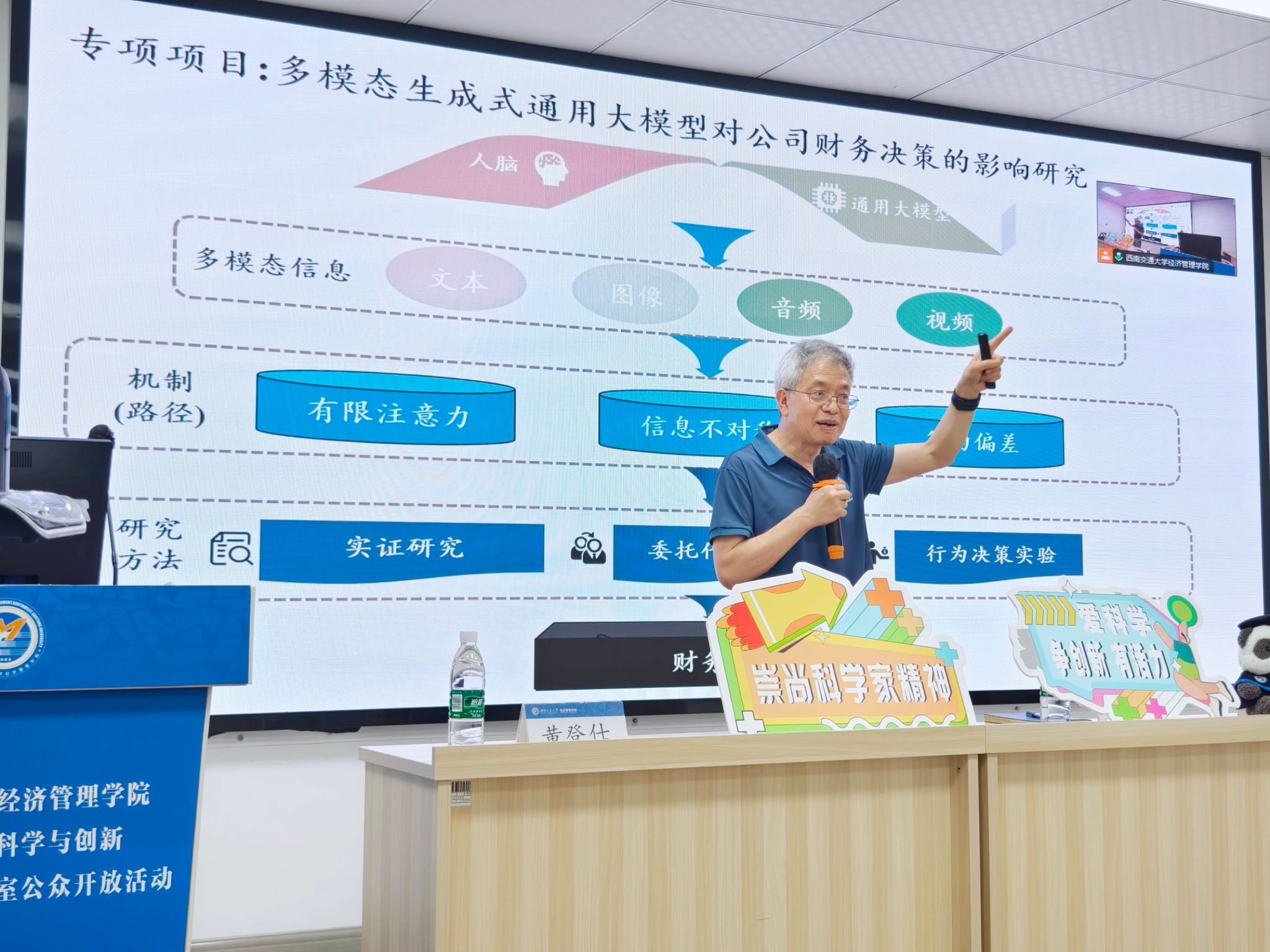5月29日上午9点30分,开放活动学术讲座于信息楼0819教室正式开始,黄登仕教授以“生成式通用大模型与ESG”为题进行了学术讲座。黄登仕教授提到,生成式通用大模型的普及,必将重塑产业形态,重新构建企业内部各生产要素的组织逻辑,塑造全新的商业生态。他从生成式人工智能对碳排放的影响、生成式人工智能带来的就业机遇及挑战、生成式人工智能对信息环境带来的影响等三个方面重点讨论了生成式通用大模型对ESG的影响。他在讲座结束时欢迎大家参与到“多模态生成式通用大模型对公司财务决策的影响研究”项目中来。