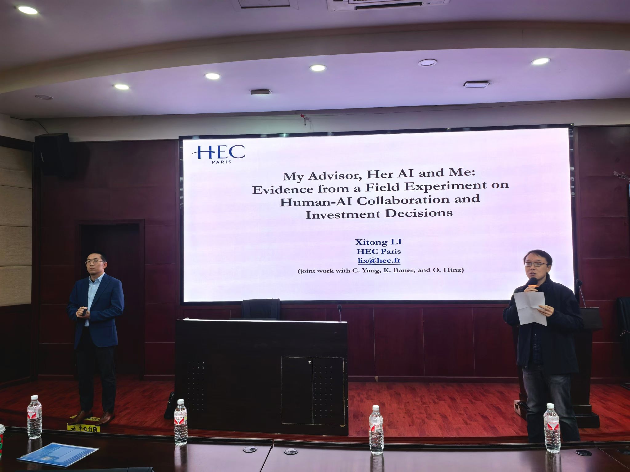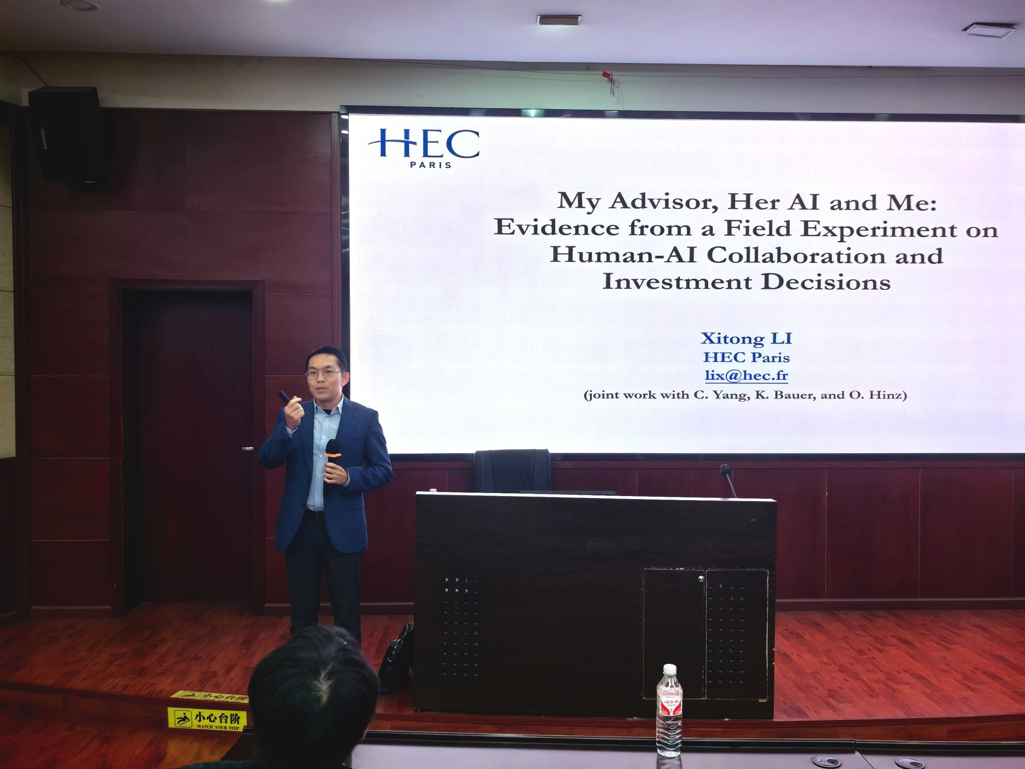 李喜彤教授随后分享了自己的前沿工作论文。李教授团队基于一项针对大型储蓄银行的田野实验,探讨了与纯AI解决方案相比,人类与AI合作的模式是否能够更好地为客户提供建议。