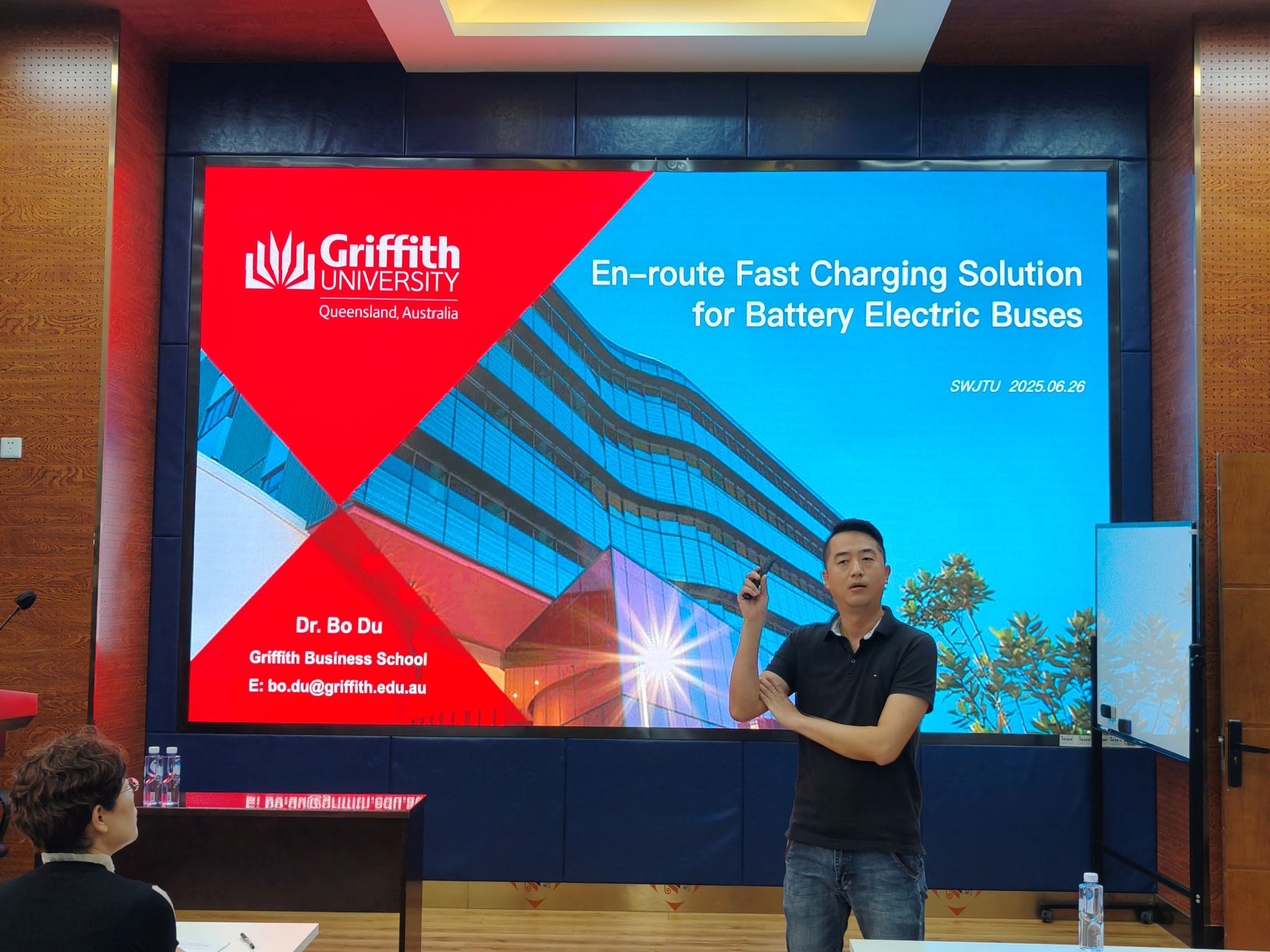 2025年6月26日上午,澳大利亚格里菲斯商学院杜波老师应邀为best365官网师生带来一场题为“En-route Fast Charging Solution for Battery Electric Buses”的学术讲座。本次讲座由best365网页版登录官方网站信息系统与运营管理系陈彦如教授主持,学院部分师生参加了此次活动。陈彦如教授首先介绍了杜波老师的学术背景,并代表学院对杜波老师的到来表示热烈欢迎与诚挚感谢。
