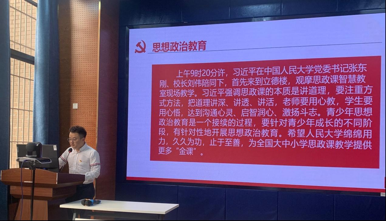 紧接着,党支部书记陈建奇带领支部成员学习习近平总书记的重要讲话。他首先带领大家认真学习习近平总书记在中国人民大学考察时的重要讲话。