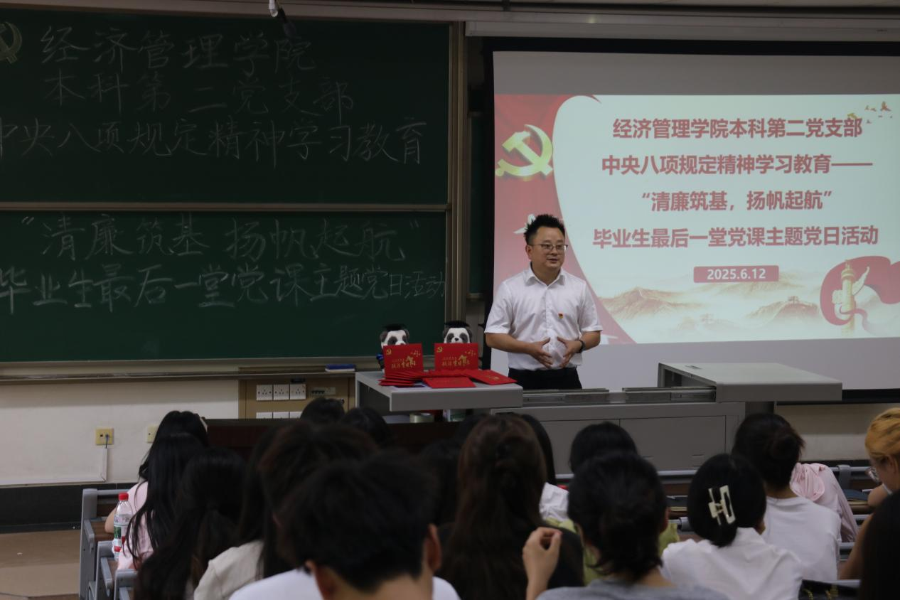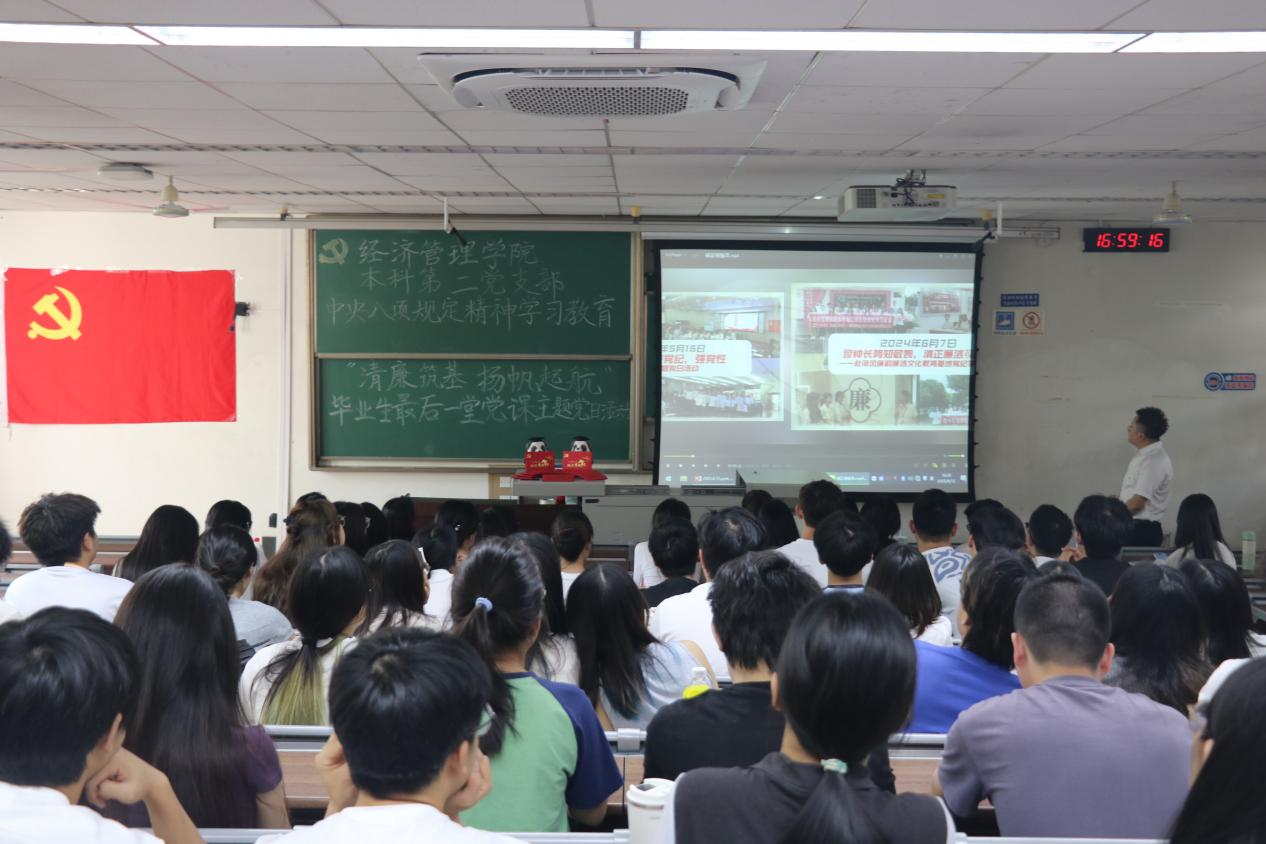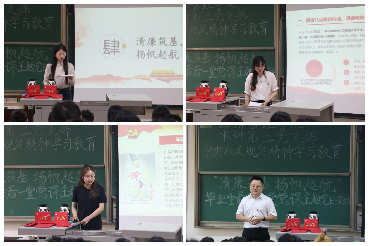 为深入贯彻中央八项规定精神学习教育,强化党员的廉洁自律意识,进一步增强毕业生党员的党性意识和社会责任感,6月12日,best365网页版登录官方网站本科第二党支部于J4310开展深入贯彻中央八项规定精神学习教育——“清廉筑基、扬帆起航”毕业生最后一堂党课主题党日活动。