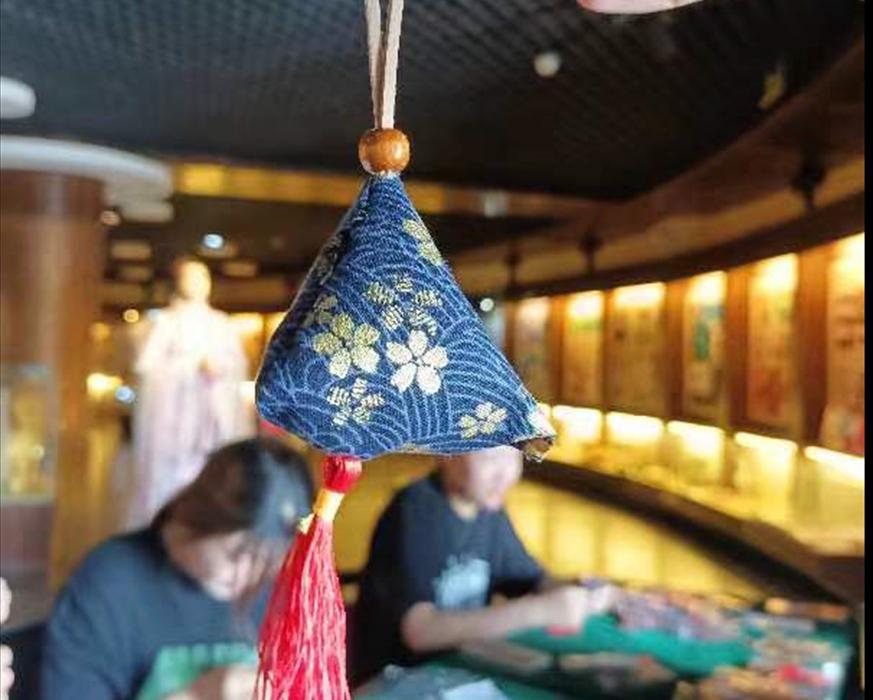 古人把香囊称之为“容臭”,俗称“香袋”,作为清香驱虫的物品使用。《礼记.内则》:“男女未冠笄者,鸡初鸣,咸盥漱……皆佩容臭”。香袋多以色彩鲜明的丝织物缝制,在其中常会填充一些具有芳香避秽的功能的中药香料。因香袋具有驱赶蛇虫的功能,便寓意端午佩戴香袋可驱除邪祟、祈福防病。本次端午节活动游客纷纷动起手来自己制作各种不同样式的香袋,让一个个寓意美好的香袋变得更加有意义。