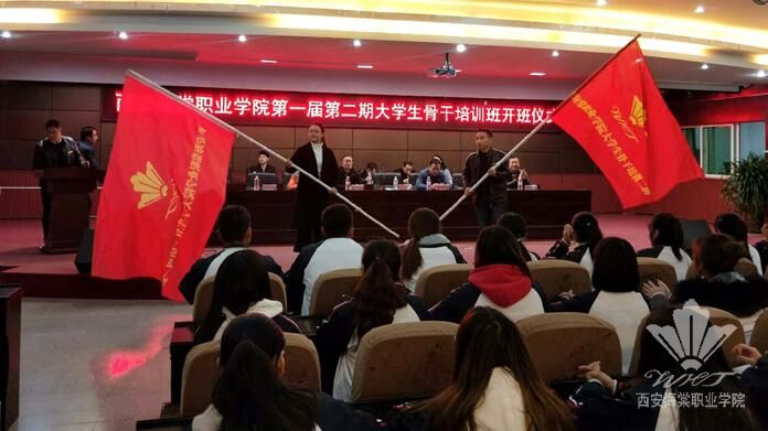 党委副书记、副院长吕博为大学生骨干培训班授旗,学生处副处长赵刚刚、团委书记郁昱接过旗帜的那一刻代表着他们即将承担起这份光荣的使命。他们深知自己接过的是旗帜,但扛起的却是责任,并表示一定会秉承“服务青年学生,历练自我”的原则团结带领青年学生奋发向上,努力工作。