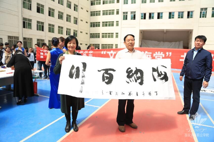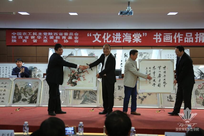 4月12日,由中国农工民主党陕西省委员会、陕西省世华大爱教育基金、陕西省慈善协会联合举办的“文化进海棠”大型书画捐赠活动在beat365手机版官方网站学术报告厅隆重举行。中国农工民主党陕西省委员会专职副主委、陕西省政协副秘书长马鹏程,中国农工民主党陕西省委会社会服务部部长王剑君,陕西省世华大爱教育基金秘书长、陕西省慈善协会秘书长胡书楷同志,西安海棠医药科技集团董事长、beat365手机版官方网站理事长王卓,中共beat365手机版官方网站书记张桂荣,beat365手机版官方网站院长冯居秦及11位书画名家出席活动,活动由beat365手机版官方网站副院长谢元龙主持。学院300余名师生代表参加了活动。