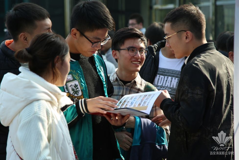 招聘会现场,学生们积极参与,大胆表现,认真与企业沟通,展现了当代大学生自信、青春的一面。