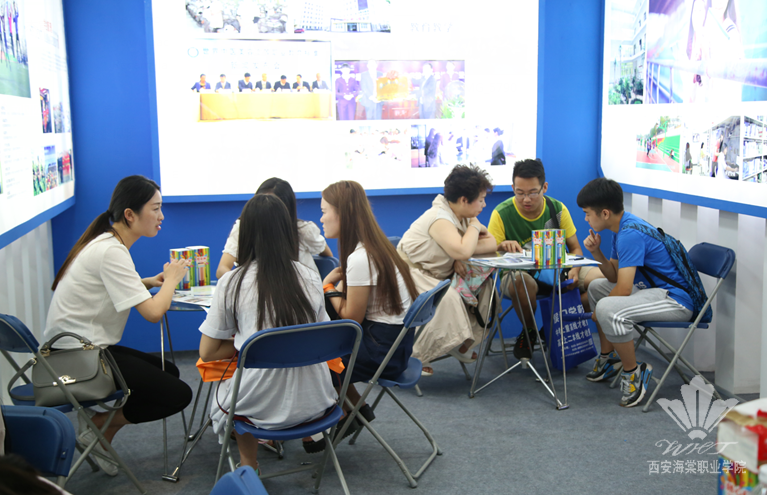 B3馆的西安海棠职业场馆内熙熙攘攘,我院教学名师、教授、各二级学院学科带头人等20余人组成的咨询团队现场为考生及家长答疑。咨询会场上,教师们为学生提供全面的招生咨询服务,从专业选择、专业设置、就业及志愿填报技巧等方面为考生进行科学全面的指导,对于家长和考生们提出的疑问给予耐心解答。而穿梭在人潮中身着蓝色T恤校服的学生志愿者们,手上或提或抱着学院宣传简章,始终面带微笑的向过往家长和学生发放,引导前来咨询的考生和家长在意向报考的专业咨询处就坐。她们得体的语言,明朗的笑容,也成为展区内一道道亮丽的风景线。3天里,我院师生热情细致的服务得到了考生和家长的一致认可,好评如潮。