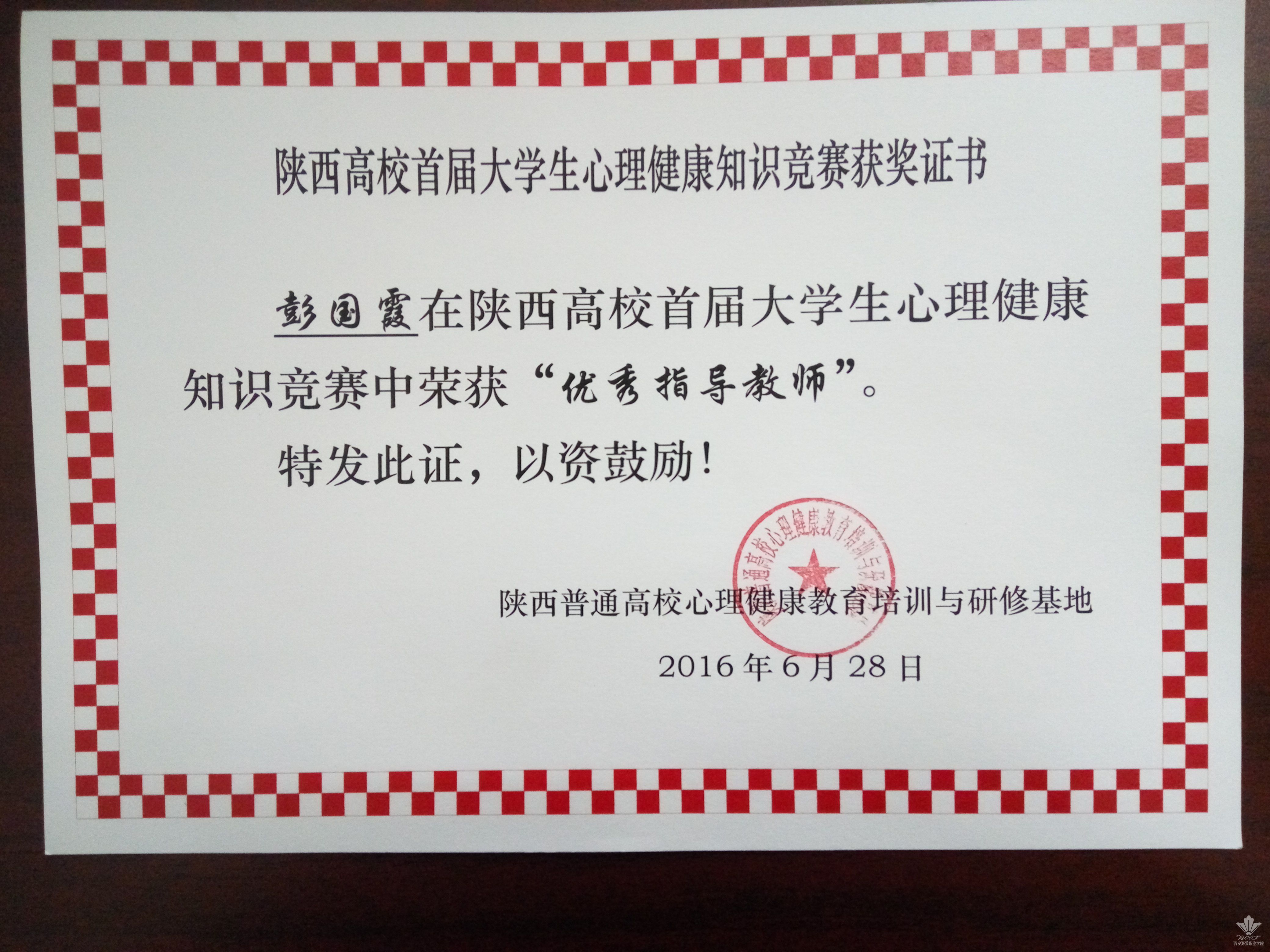我院心理健康教育中心彭国霞老师指导的工造1401班毛兴强、会计1501班卞苗苗、医美1514班赵梅、护理1511班高嘉雪、护理1505班杨文杰等学生组成的代表队参加了本次心理健康教育知识竞赛。通过两天的笔试和机试环节,我院代表队最终在本次知识竞赛中取得佳绩,卞苗苗、赵梅、高嘉雪荣获团队“三等奖”,杨文杰获得“优秀奖”,彭国霞老师荣获“优秀指导老师奖”。