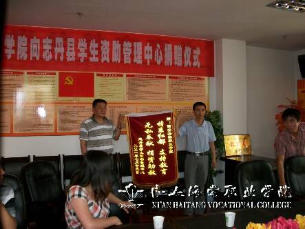 双方举行了隆重的捐赠仪式。邢处长将海棠学院捐赠的两台电脑、两台打印复印一体机、两部激光传真机、一台碎纸机亲自交付给志丹县学生资助管理中心。看到这些崭新、先进的办公设备,教育局和资助中心领导非常感动,称海棠学院的捐赠极大的改善了县级资助中心的办公条件,为提升当地贫困生的助学贷款工作环境提供了基本保障。县领导送海棠学院锦旗一面:情系红都,支持教育,无私奉献, 捐资助教!