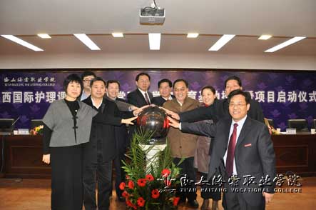 国际护理教育项目负责人胡小静,国内护理硕士、护理学副教授、中华护理学会省级分会理事及教育学组委员、美国注册护士RN执照、旅美护理学者柯永红,陕西省教委(教育厅)教育交流中心主任孙振宽、常务副主任王宁、经理王丞及我院院长冯居秦、党委书记冯齐昌、副院长王景洪、医学院院长韩勤学、教务处处长杨国峰。