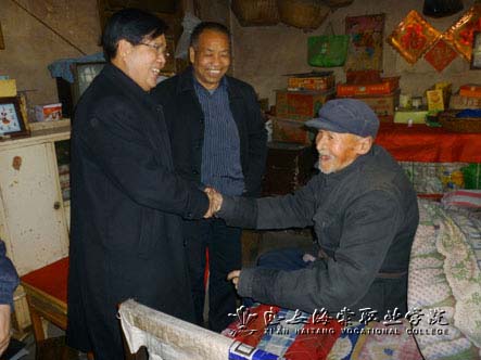 2010年12月30日下午,我院党委王爱民副书记带领党委办公室同志,代表院党委、行政,前往张李村慰问老党员、老干部张九正老人,并给他送去面粉、水果等慰问品,把海我院党政领导和全体党员、师生的温暖送到老人家中。张九正老人,今年88岁,解放初期入党,担任村干部几十年,为农村建设做出了贡献,现在他和84岁的老伴单独居住。王书记详细地询问了老人的身体情况和生活方面的困难,语重心长地嘱咐老人保重身体,欢度晚年。张九正老人十分感激,再三感谢我院党委、行政领导和全体师生的关怀。