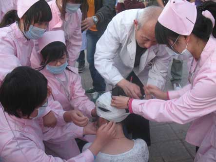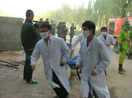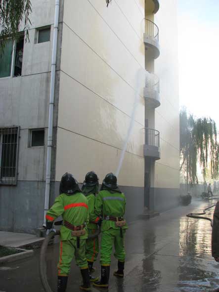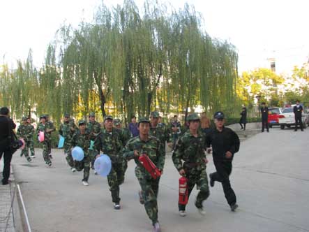 学院领导接到巡逻员的汇报立即部署了灭火救援工作,随着一声哨响,消防车、疏散救援组、警戒组、灭火组、救护组、学生清点组、机动组等相关机构在三分钟之内如同千军万马奔驰到了事发现场准备灭火救援。电工闪电般的切断了整栋公寓的电源,疏散救援组立即打开了所有的安全通道,由16名消防队员分成的四个小组迅速冲进了熊熊大火的5号学生公寓,开始了对学生实施安全疏散和救援。3分钟左右全部学生被救援组迅速救出并被转移到了安全集合点,经清点发现两名学生还未能顺利撤离,保卫处处长安学文立即向消防员发出搜救命令,并通知救护组赶往现场做好接应工作,安学文队长亲自带队冲向已被大火和浓烟包围的公寓,开始了对两名学生搜救工作,搜救人员以百米冲刺的速度跑遍了楼内大大小小的角落,约2分钟就发现了被困学生,一名学生无伤情被送往安全集合点,另一名重伤学生在1分钟之内被救护组顺利救出并抬至“安全地带”送往医院。学院红色的消防车上高高的站着几名消防人员,手持灭火设备将水射向公寓起火处,水就像一条白龙从空气中直穿火源处,瞬间火势就被控制。