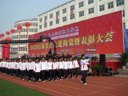 校旗引导,校徽随后,紧接着中医美容、护理、空中乘务、康复治疗技术、管理专业、教职工、中等专业学校、学院2010西安世界园艺博览会海棠志愿者等8个方队在激昂的乐曲中迈着矫健的步伐,喊着响亮的口号经过主席台,他们向与会嘉宾和媒体展示了海棠人的风采。