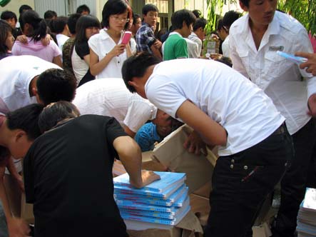 截止8月31日下午,2010级新生军训工作已经圆满结束。为确保学生教材课提前到位,有力地保障学院教学工作的正常开展。8月31下午,新生们以班为单位在教材发放处领取新课本。