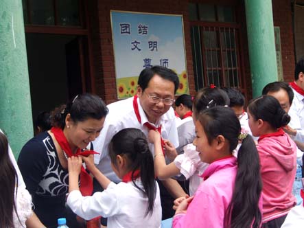 在“只要人人都献出一点爱,世界就会变成美好的明天......”的歌声中,各高校校长、单位领导把捐助款亲手交到22名贫困学生的手中;少先队员向各位校长、领导系上鲜艳的红领巾、致以崇高的少先队礼。