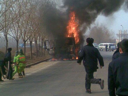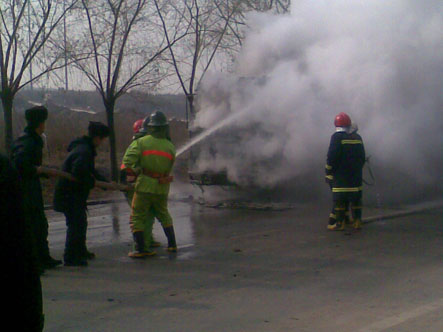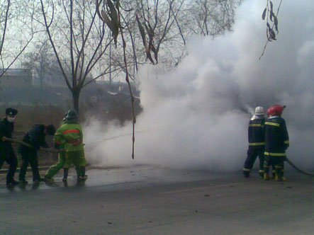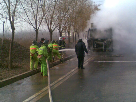 2009年12月18日中午11:30分,防火科接上级指示在学院南门外公路有一环卫车发生着火,迅速出警。在总指挥邢军处长、现场指挥张景利队长的带领下,消防队员张景顺、阴豹、徐守灿、郭鹏瑞、王小科、吴亚伟、杨帆、李印英勇奋战、争分夺秒,对火势进行扑灭,12:15分火情的到了有效控制。因抢救及时此次火灾未造成其他重大事故及人员伤亡。