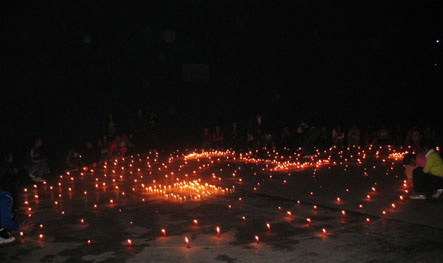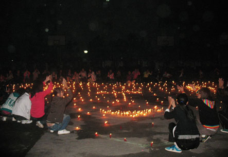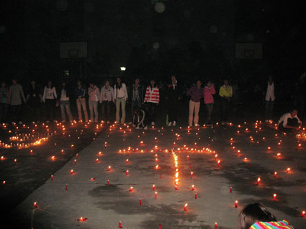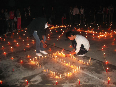 班委成员刘文慧、魏栋、张强、郭贇组织全班学生买了150根蜡烛,在学院的东操场自发组织将蜡烛围成一个心,每人负责一个蜡烛。 晚上9;00,他们集体点亮蜡烛,并且高呼:医美0902班全体同学,祝愿辛勤的园丁节日快乐!伴随着优美的音乐,蜡烛静静的燃烧,他们静静的在心里为老师祈祷!
