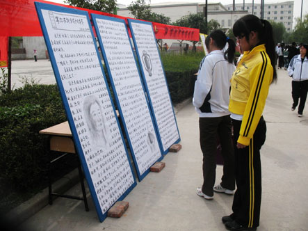 2009年10月19日中午12点,记者来到篮球场边,映入眼帘的是路旁整齐的摆放着的展板。展板上张贴的是学生的优秀作品,路过的同学们不约而同的聚集在各个展板前,仔细认真的欣赏展出的优秀作品,很多欣赏者对一些作品表现出了浓厚的学习兴趣。