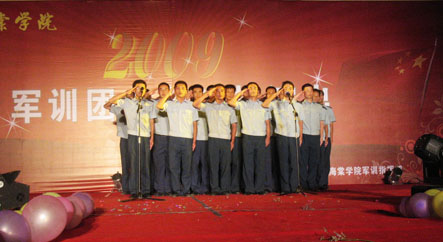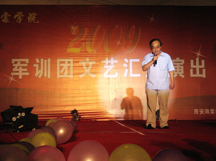 为充分展示当代大学生的人格魅力和精神面貌,用青春构建和谐,谱写美丽人生的青春章。2009年8月31日晚,我院09级新生军训团军训汇演在我院顺利举行。陕西海棠集团总经理王卓同志,我院院长冯居秦同志,军训团团长王鉄练同志,副院长兼军训团政委吕博同志,副院长蒋国瑜同志,副院长王景洪同志,院长助理赵景利同志以及学院各处室的领导出席并观看了演出。演出中各位领导对此次演出给予了高度的评价。