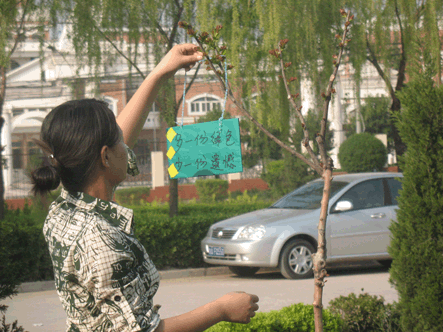 参加此次活动的是绿色环保协会及卓越讲师社团的全体成员,共计50余人。他们分别制作了各式各样的环保小牌子,并悬挂于我院的花草树木上,以此作为标识。希望我们每个人都能爱护花草树木,保护校园环境。