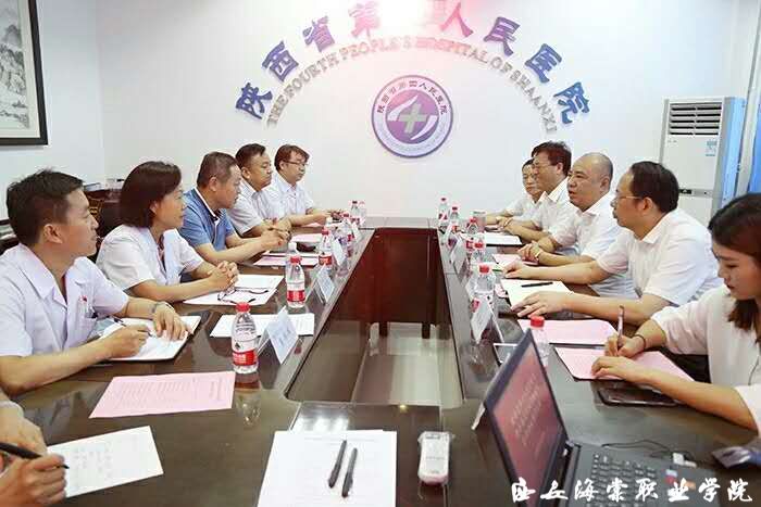 2018年8月2日下午,为顺利推进beat365手机版官方网站与陕西省第四人民医院就建立高标准临床医院、“医养一体化模式”等方面的合作,陕西省第四人民医院主要领导及口腔科、医务科、影像科等各部门科室负责人前来海棠学院进行参观。双方就如何打造高标准的临床医院进行了探讨,并就医院内部的各个科室建设的规模以及如何设计进行了明确。