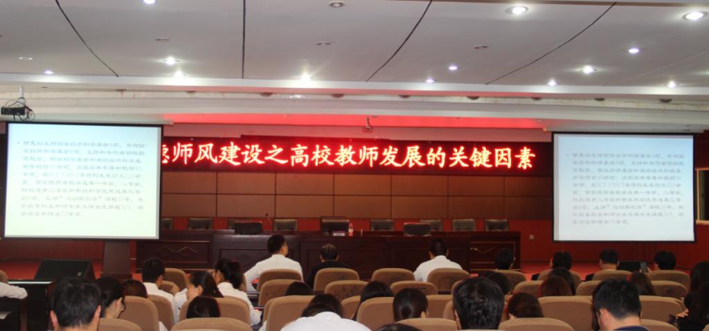 为了贯彻落实习近平总书记在全国高校思想政治工作会议上发表的重要讲话精神、教育部《关于加强高等学校青年教师队伍建设的意见》和《关于建立健全高校师德建设长效机制的意见》的文件精神,在学院党办及党委书记张桂荣同志的指导与帮助下,9月21日下午,教师发展中心有幸邀请到陕西师范大学师德师风教育专家田振军教授,在学术报告厅为全体教职工做题为“高校教师发展的核心要素”专题报告会,此次报告会拉开了我院2018-2019学年师德师风建设的序幕。学院郭国庆副院长、高琦主任、周建科主任、于启波处长、王建军处长、崔东升处长、张建利副处长、张鑫副处长、医美学院路峰副院长等同志莅临报告会现场,与全体教职工一起聆听了报告会。报告会由高琦主任主持。