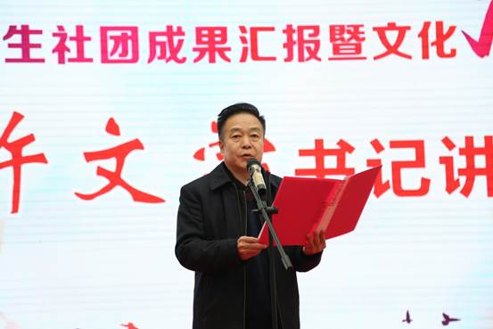 院党委许文学书记发言,他表示,社团是大学生素质教育的重要载体,是大学生开发潜能、展示自我、提高综合素质的舞台。学院党委高度重视学生社团的工作,长期以来,学生社团在党委领导下,经过学院团委的精心指导,保持着良好的发展态势。学生社团的数量、人数和类别百花齐放、生机盎然;活动内容和形式也在不断丰富,推动了校园文化建设的深入开展。希望团委和社团组织充分发挥在社团建设中的核心作用,继续加强和改进学生社团工作,积极扶持、精心指导。继续为学院的发展做出新的更大的贡献。