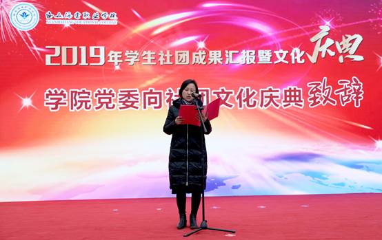 党委办公室侯月瑞主任致辞,她代表院党委对本届学生社团文化庆典顺利开幕表示热烈的祝贺,并向全院师生致以亲切的问候。她表示学生社团是高校第二课堂的重要组成部分,是学生开发潜能、展示自我的舞台,也是我院推进大学生素质拓展计划的重要载体,在培养学生综合素质、营造校园文化氛围、传承学校独特文化等方面发挥着重要作用。也希望此次庆典的举办,能给同学们提供更多锻炼的机会和展现自我的平台,以社团文化来提高同学们的综合素质。
