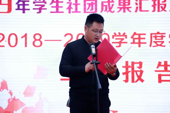 院团委康有为副书记作社团工作报告。他回顾了过去一年里,学院社团联合会和各社团取得的骄人成绩。他表示,在院领导的关怀和重视之下,我院社联迎来了发展壮大的黄金时期,在以丰富校园文化、服务社团发展、引领社团文化的指导思想下,社联以稳健的脚步向前发展。并向一直以来对学院工作积极配合的各社团表示衷心的感谢,希望他们不忘初心、牢记使命、砥砺前行!