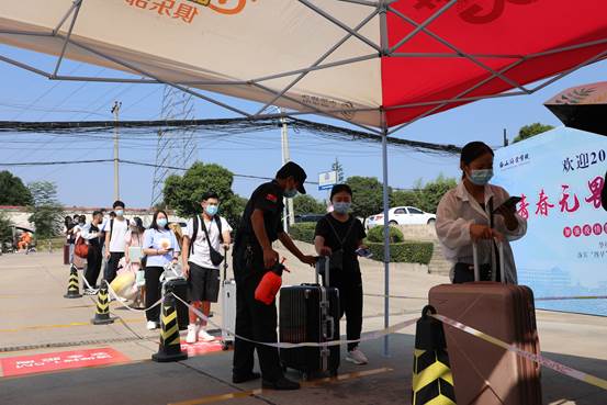 8月28日下午,我院迎来了学生返校小高峰。学院北门口,同学们按照指定的通道有序排队(保持1米以上间隔),经过行李消毒、扫描二维码、核验学生证、监测体温等流程进入校园。