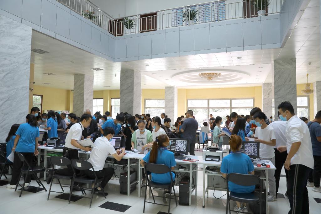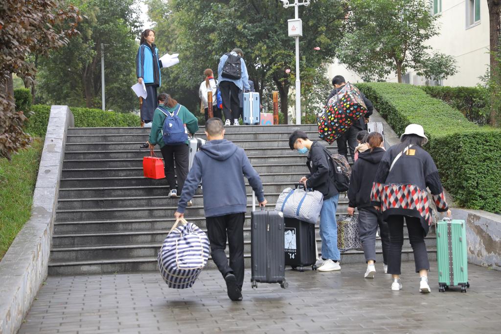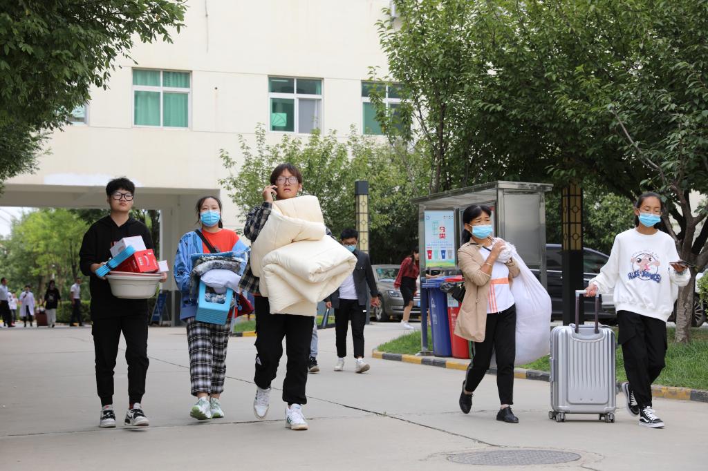 接待大厅,由学院领导、招办工作人员及校内接待在校生组成的志愿者团队用最饱满的热情迎接新同学的到来,他们耐心引导,为新生及家长答疑解惑,帮大家搬运行李。学生志愿者表示:去年刚入校时很多学长学姐热心帮助我们,今年我也想把这份温暖传递下去,帮助更多的新同学。