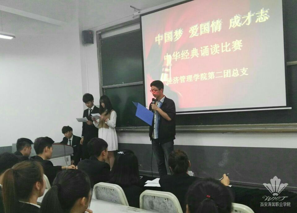 2016年4月19日16时,我院第一团总支和第二团总支分别在4411教室和2213教室举办了以“中国梦、爱国情、成才志”为主题的中华经典诵读比赛。院团委主要领导干部以及全体学生干部参加本次活动。