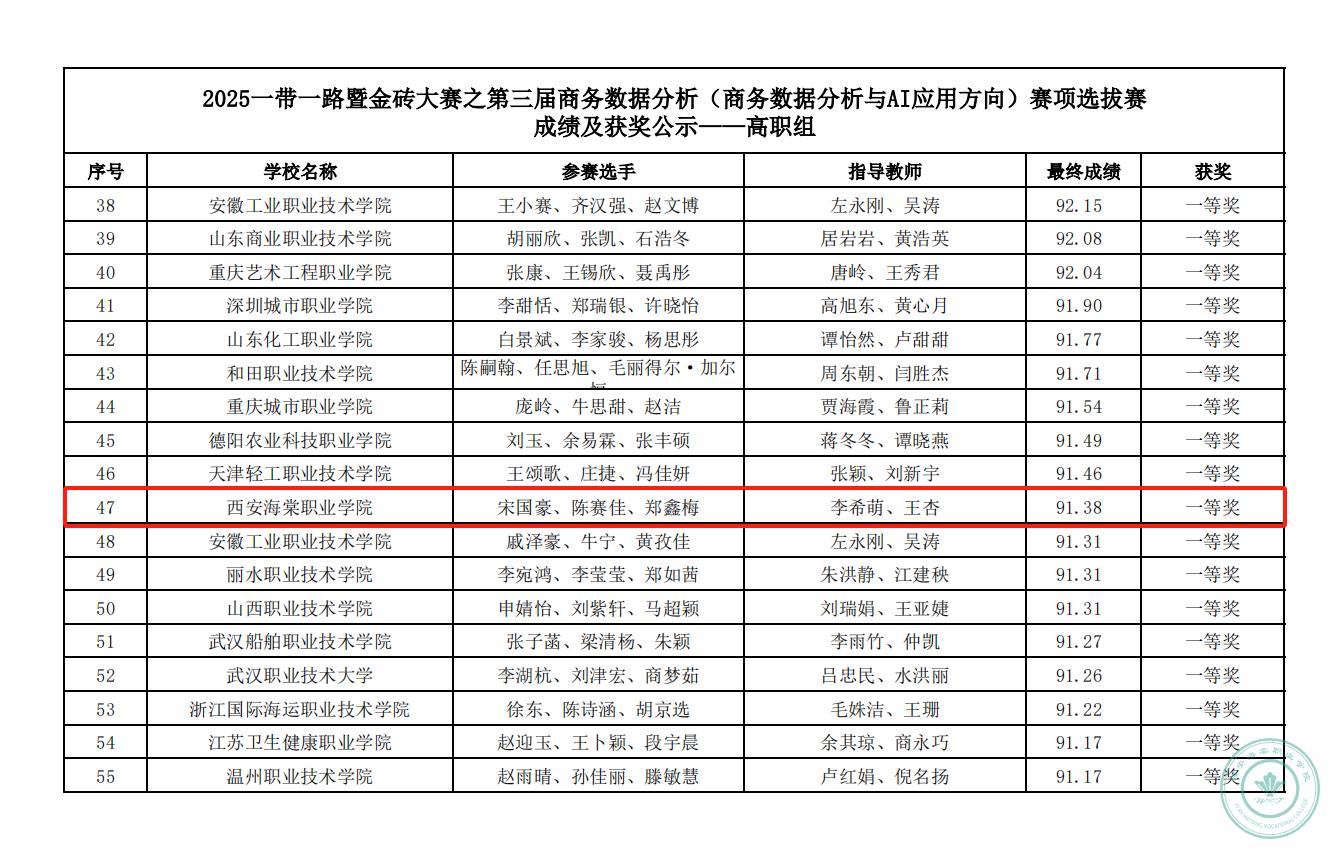 2025年6月21日,由一带一路暨金砖国家技能发展国际联盟,教育部中外人文交流中心联合主办的2025一带一路暨金砖大赛“商务数据分析”赛项,现代技术系学生宋国豪、陈赛佳、郑鑫梅,在指导教师王杏和李希萌老师的精心指导下,以课堂所学为基石,以创新实践为羽翼,精准运用数据分析工具,三位同学凭借扎实的专业素养、紧密的团队协作,在比赛中展现出优异的竞技水平,为学院赢得了宝贵的荣誉!