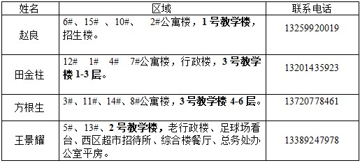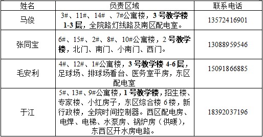为切实提升后勤员工服务质量,建立“责任到人,上门服务”的良好服务机制,现将学院所有水工、电工、木工维修区域及联系方式予以公布: